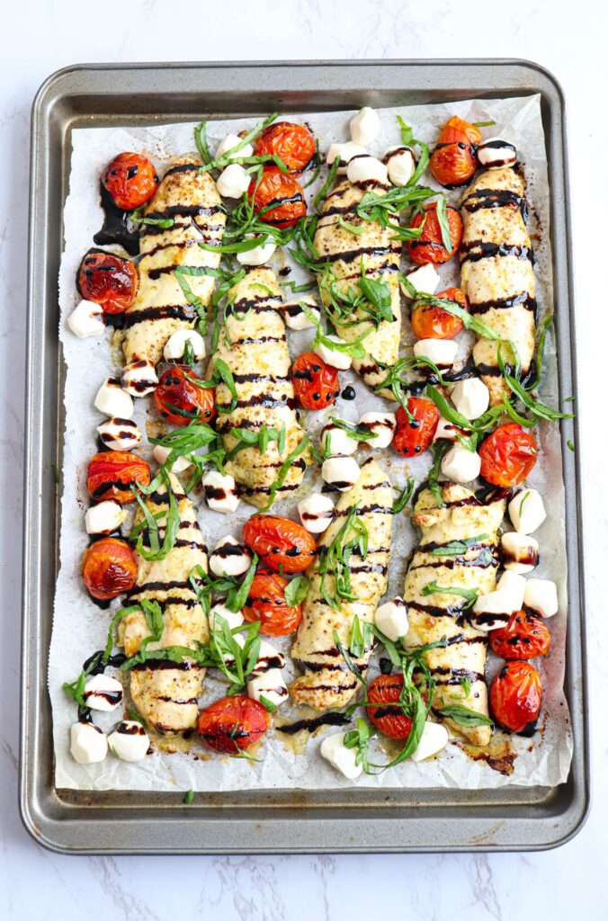 I am obsessed with chicken caprese. So, this sheet pan recipe is right up my alley! It calls for just a few simple ingredients and about 30 minutes of your time.