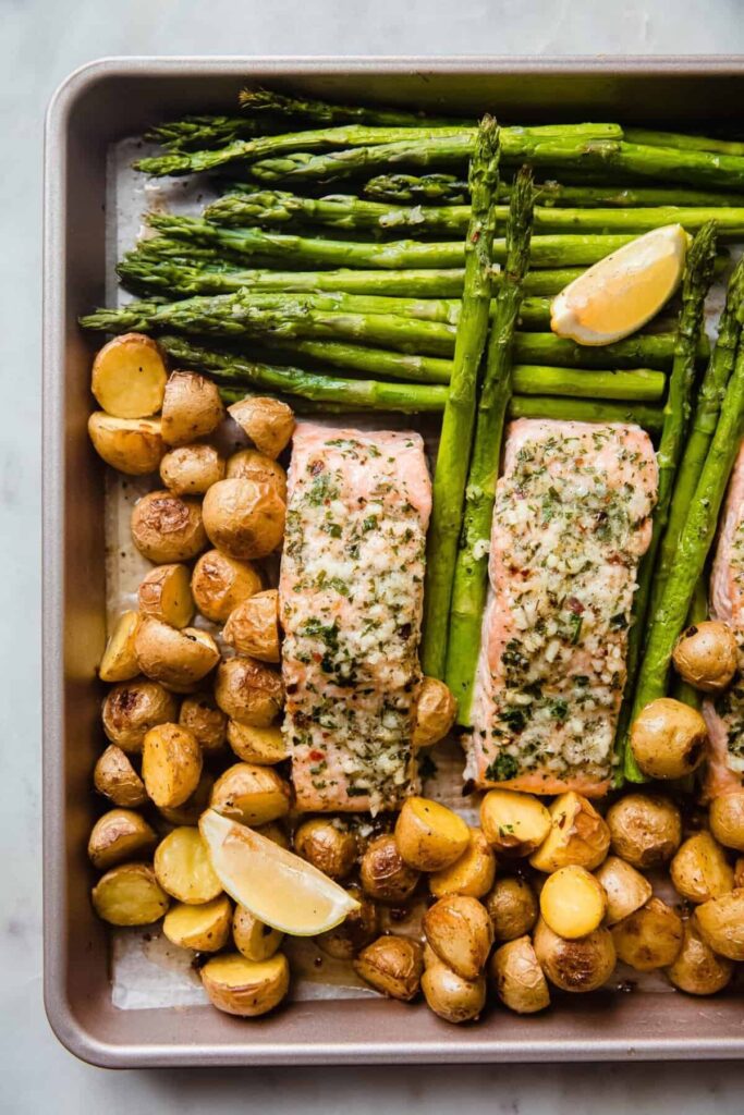 11. SHEET PAN GARLIC BUTTER SALMON WITH ROASTED POTATOES AND ASPARAGUS