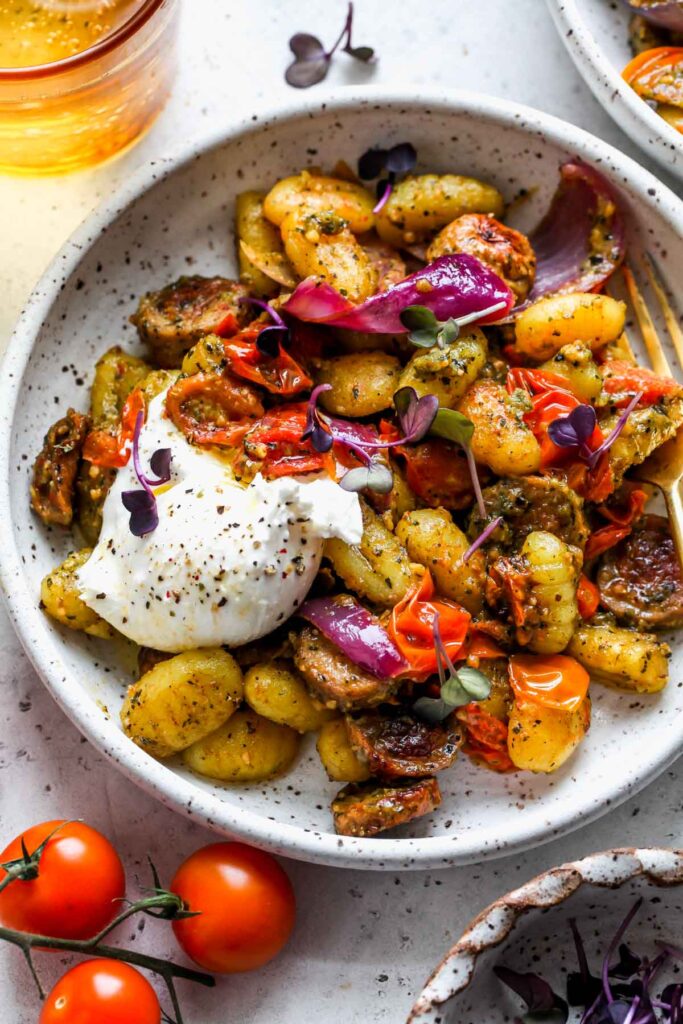 Potato gnocchi, Italian sausage, and veggies make for an effortless meal. It is all prepared in one pan, which means no worrying about dishes, and it takes only 5 minutes to prep.