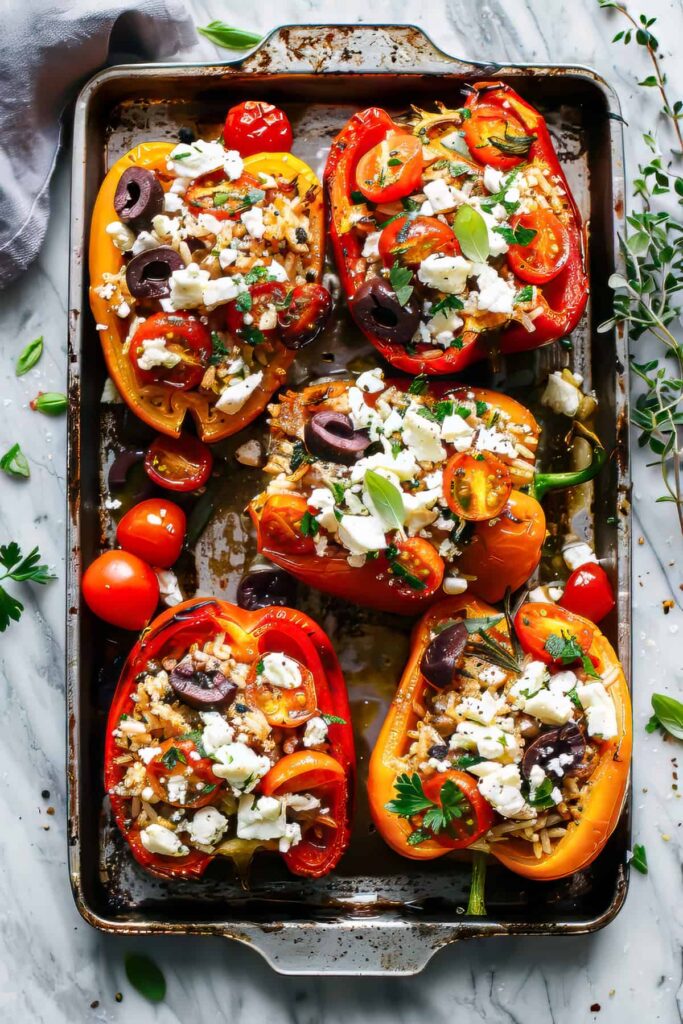 I love stuffed peppers. It’s one of my go-to lunches. It is super easy to make and tastes amazing! These greek style peppers are stuffed with lemony rice, marinated tomatoes, and olives.