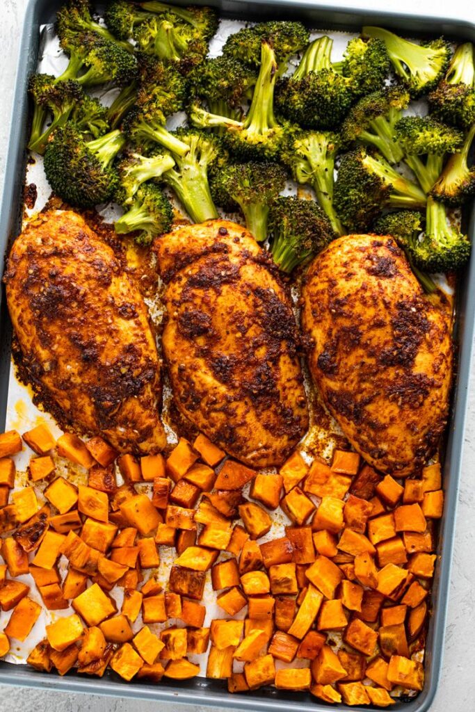 This one-pan roasted chicken, broccoli, and sweet potatoes is packed with flavor and is perfect for meal prepping as well.
