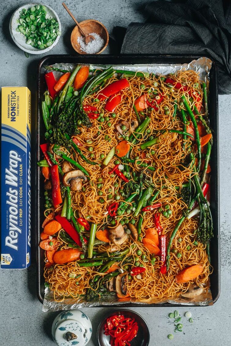 Make dinner in a breeze with this sheet pan chow mein recipe. It is made with broccoli, mushrooms, carrots, bell peppers, green onions, and of course, noodles.
