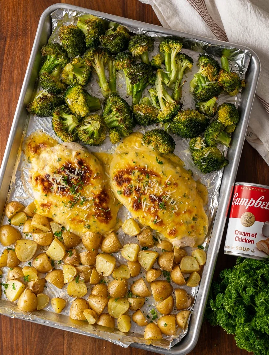 Make a complete meal in just one pan! This recipe features juicy chicken breasts, tasty broccoli and potatoes, and is topped with creamy parmesan sauce that’ll make you come back for seconds!
