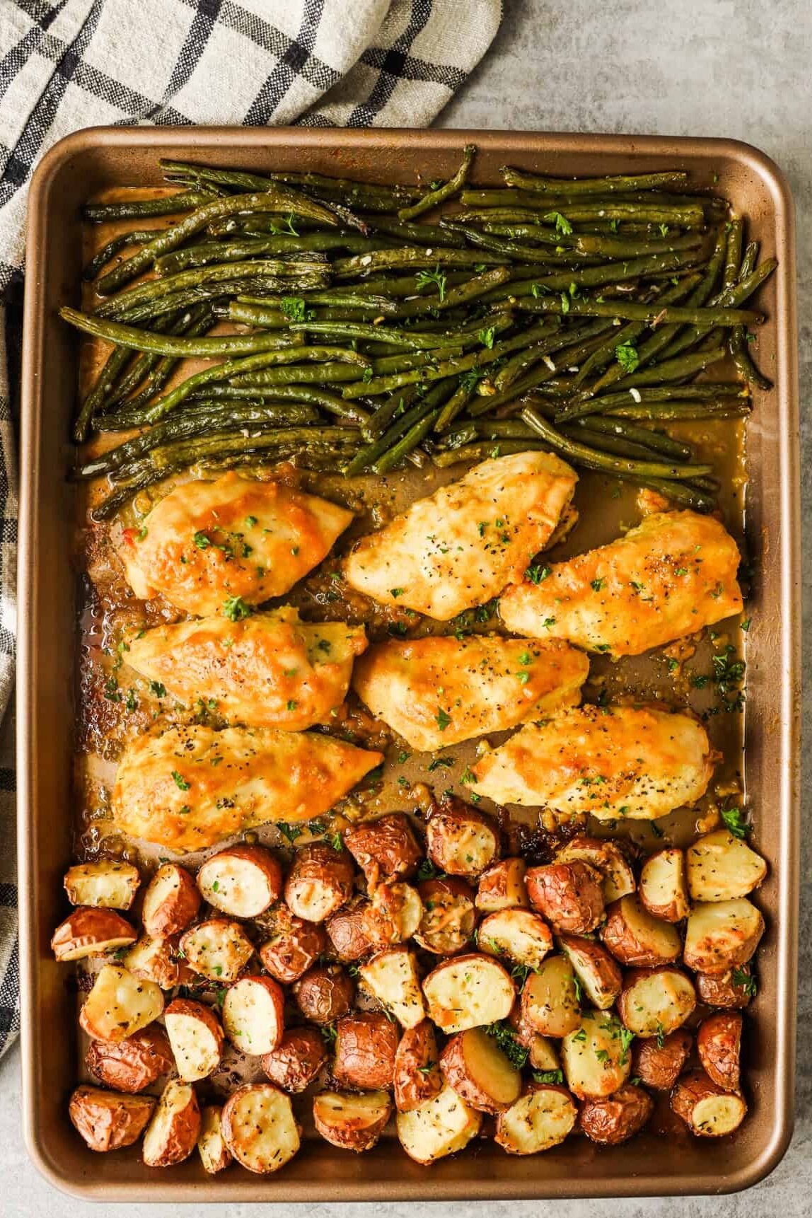 This includes crispy roasted potatoes, garlicky green beans, and super tasty parmesan-crusted chicken.