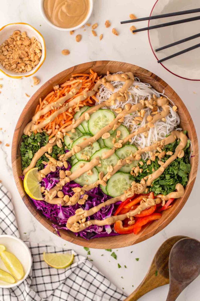 Do you love Vietnamese summer rolls? If so, this spring roll salad with peanut sauce is calling your name. Enjoy noodles, healthy veggies, fresh herbs, and tasty peanut sauce in under 30 minutes.