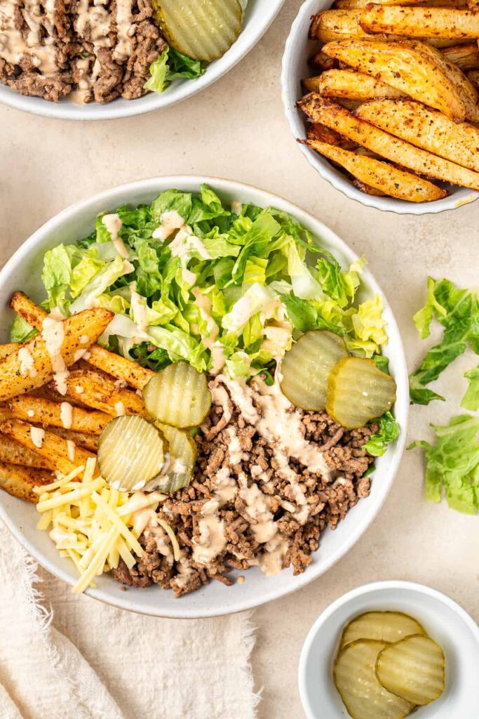 Do you know what’s even better than a burger? A burger bowl! It has all the same flavors and ingredients you know and love, but is so much more filling.