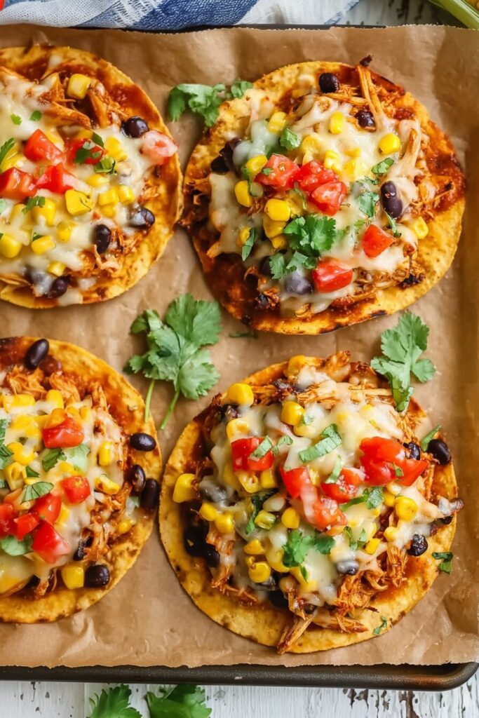 They are made with corn, shredded chicken, fresh toppings, and a squeeze of lemon.