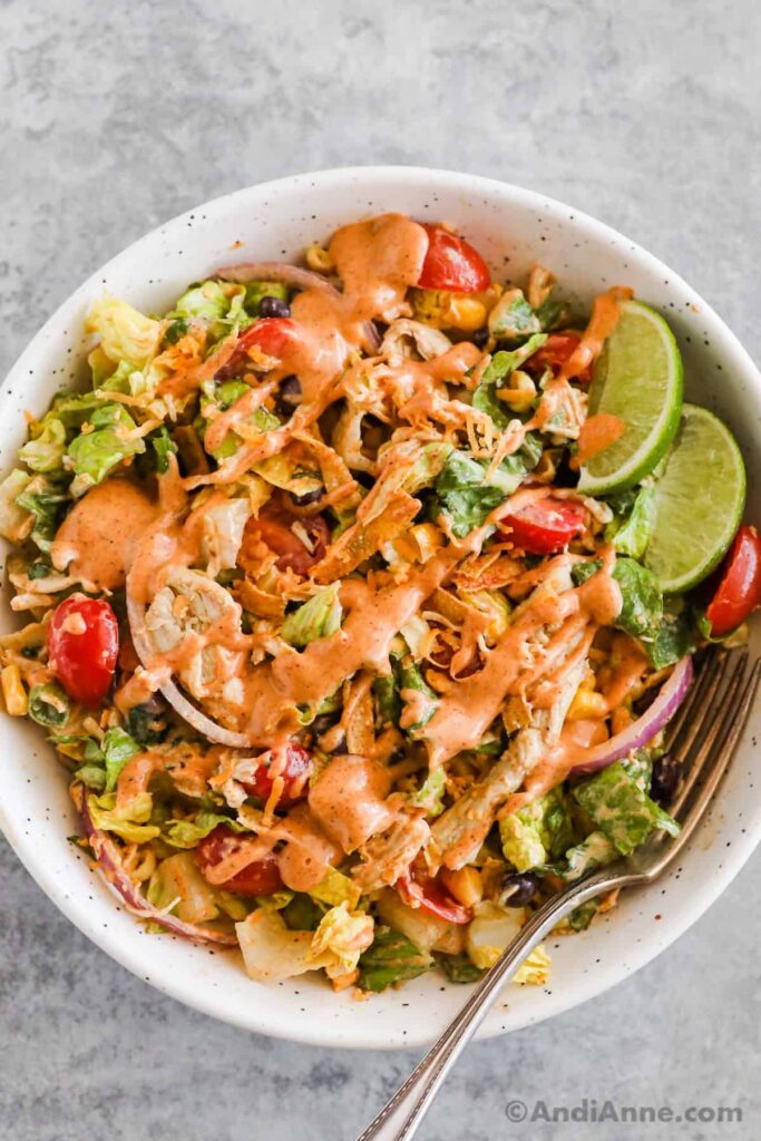 This taco chicken salad is made with lots of veggies, chicken, black beans, cheddar cheese, and tortilla chips.