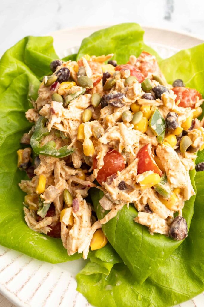 It has lots of spices, veggies, and protein. You can eat this on its own or make it into a chicken salad wrap with lettuce.