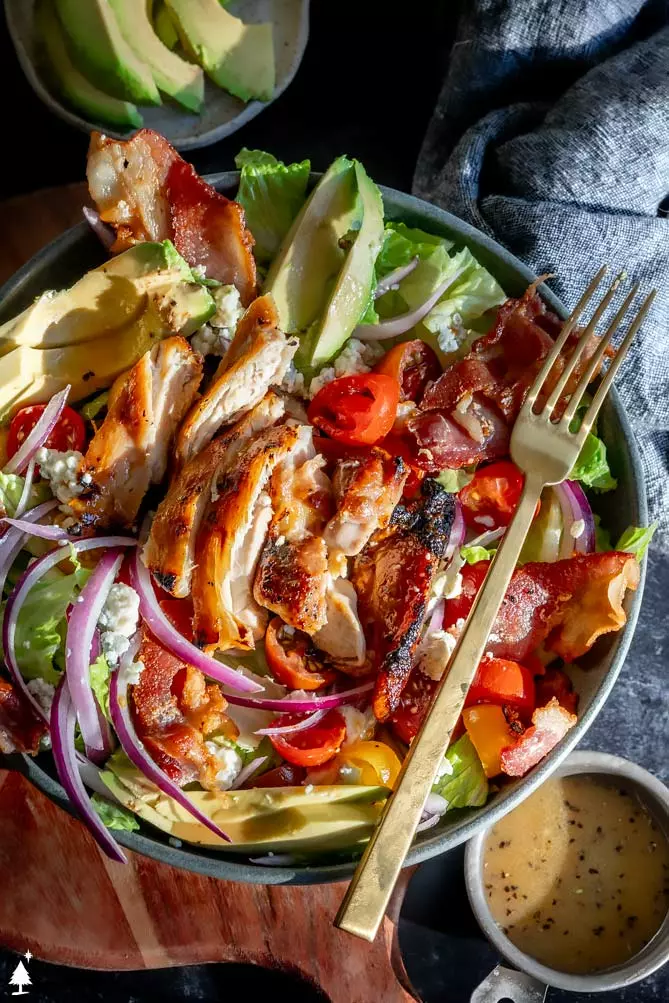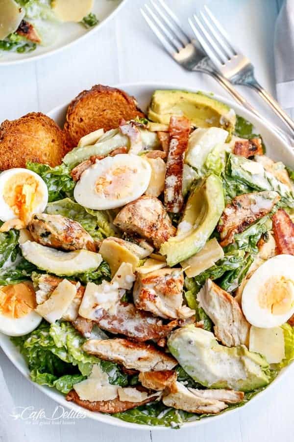 This salad is literally so good, it has less fat and a lot of protein. It’s made with chicken breasts, bacon, eggs, lettuce, avocado, and Parmesan cheese, and is coated in the most delicious dressing.
