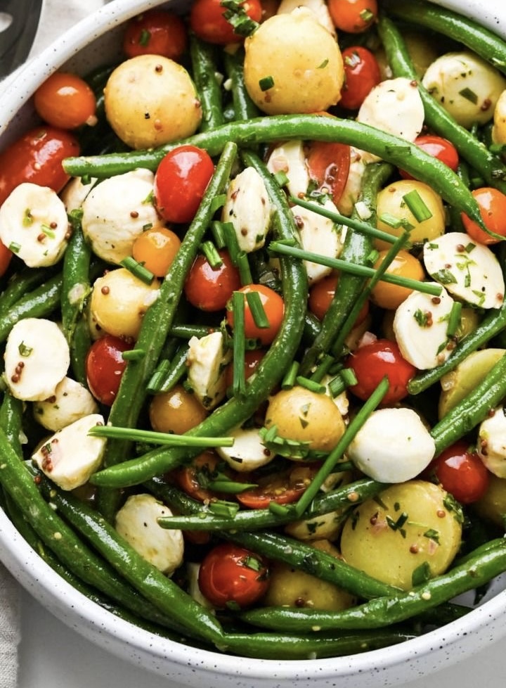 It is made with green beans, potatoes, tomatoes, mozzarella, and tangy lemon mustard vinaigrette.
