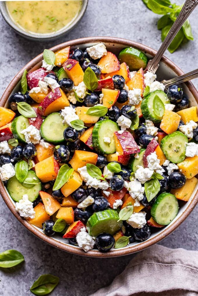 It is made with cucumber, blueberries, peach, and feta cheese, and is coated in a tasty lemon basil vinaigrette.