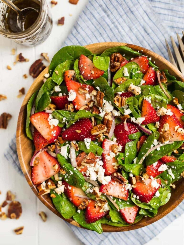 Looking for a healthy lunch or dinner? This spinach and strawberry salad is calling your name. It includes spinach, fresh strawberries, feta, toasted pecans, onions, and a delicious balsamic poppy seed dressing.