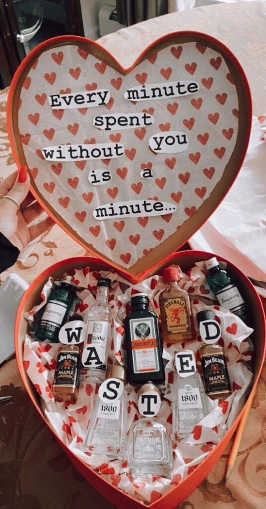 How cute is this? All you need for this is mini bottles of alcohol and a heart-shaped box. Place the bottles inside and make cutouts of the words “every minute without you is wasted”.