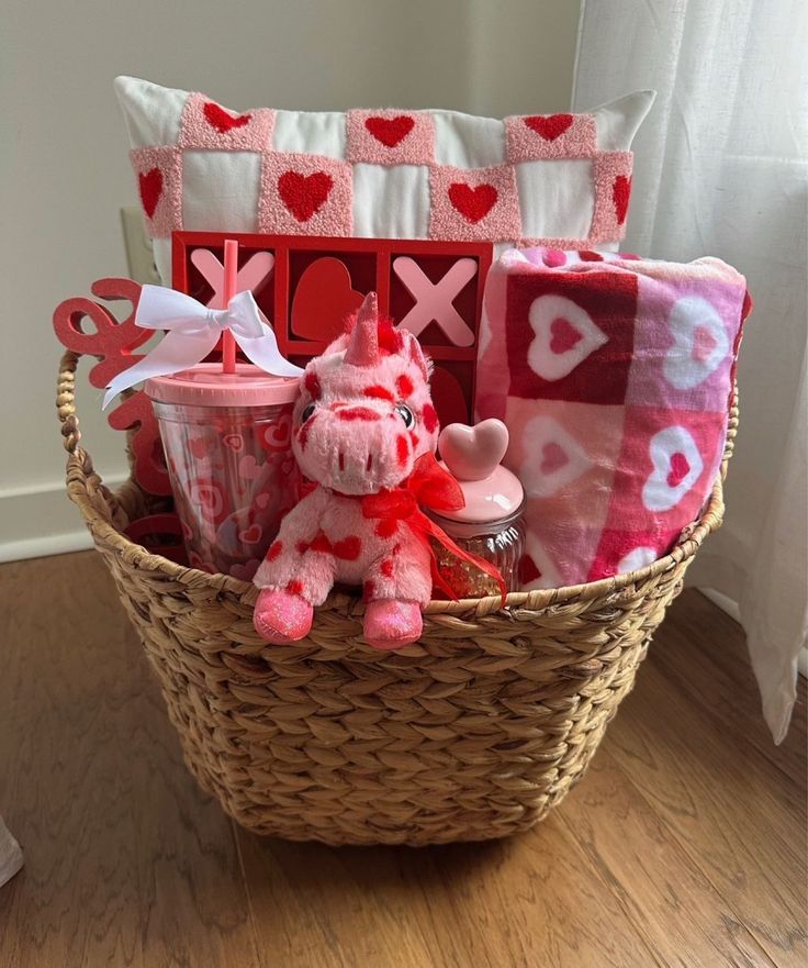 Brighten up your girl’s day and create this adorable little gift basket for her. First, grab a pink basket. Fill it up with colorful shredded paper.