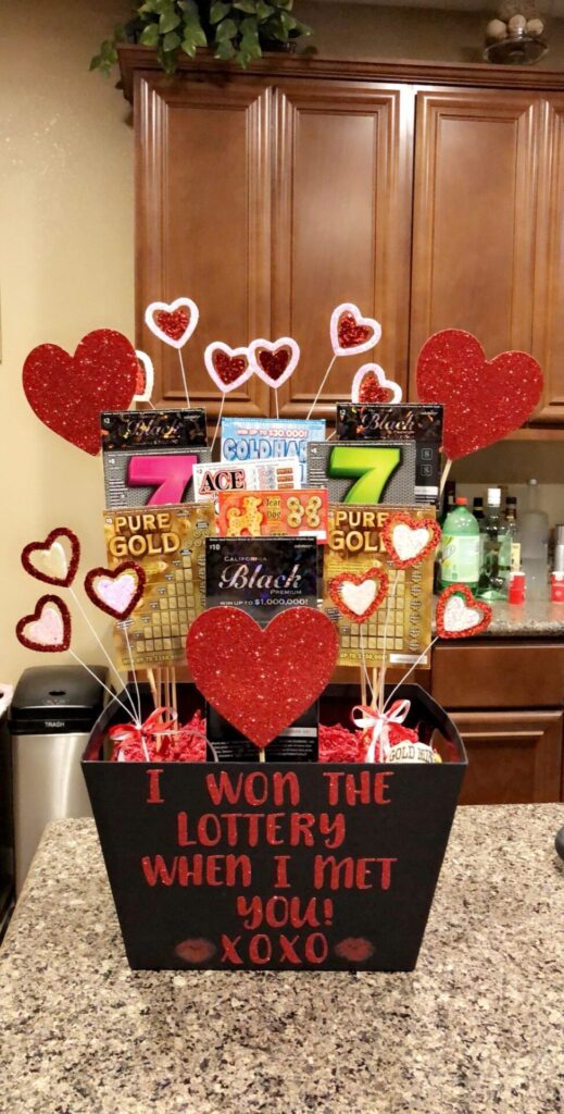 Make cutouts of the letters with red paper that spell out ” I won the lottery when I met you” and glue them on the front of the basket.