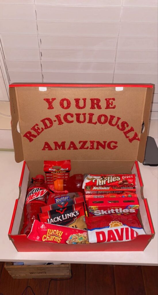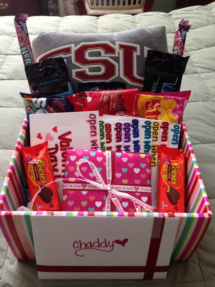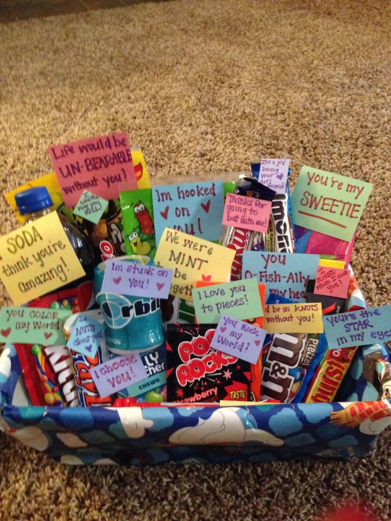 Head to Walmart or the Dollar Store and buy lots of snacks. Include their favorite chips, candies, sweets, drinks, along with a few decor items and a cute picture of the two of you together.
