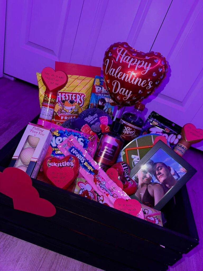 Grab a basket and include lots of snacks and sweet treats, a few drinks, and face masks, because why not? Along with some V-Day themed decorations to complete the gift.