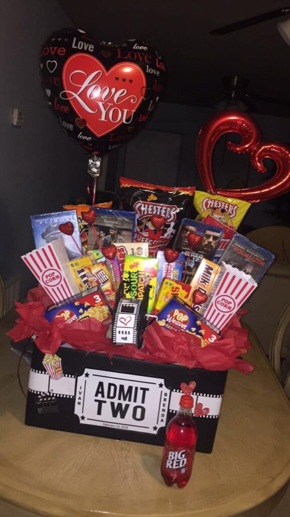Grab a basket and place your guys’ favorite drinks, some snacks, popcorn, ice cream, and a gift card for Netflix or other streaming services.