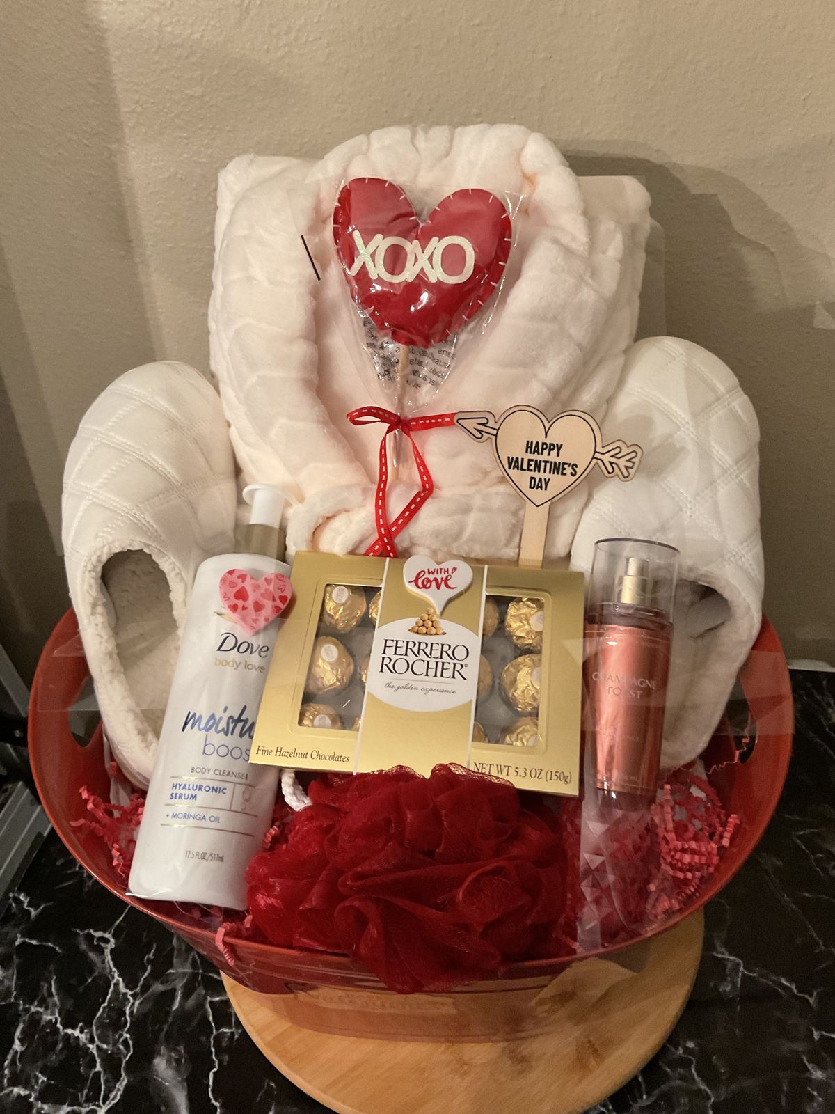 If your girlfriend loves to take baths, she is going to love this gift basket. Just grab any basket you can find; it doesn’t have to be pink or red.